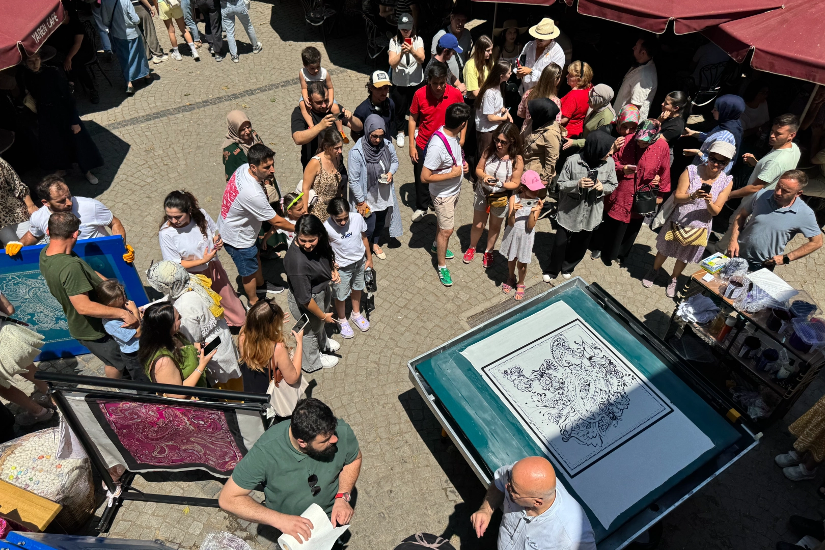 Geleneksel masa baskısı atölye çalışmasında, ustalarla birlikte rakle çeken vatandaşlar, birbirinden güzel desenlerin basıldığı ipek kumaşların kurumasını ve ortaya çıkan görsel şöleni hayranlıkla izledi.
