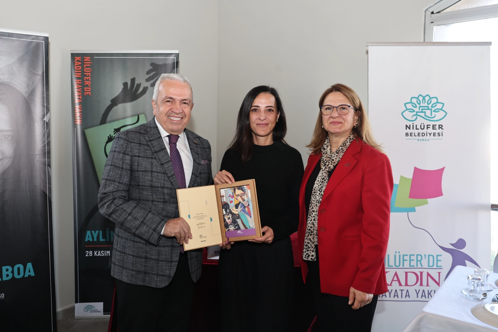 Etkinlik sonunda, Nilüfer Belediye Başkanı Şadi Özdemir yazar Aylin Balboa’ya teşekkür etti. Aylin Balboa, etkinlikte kadınlar için kitaplarını da imzaladı.