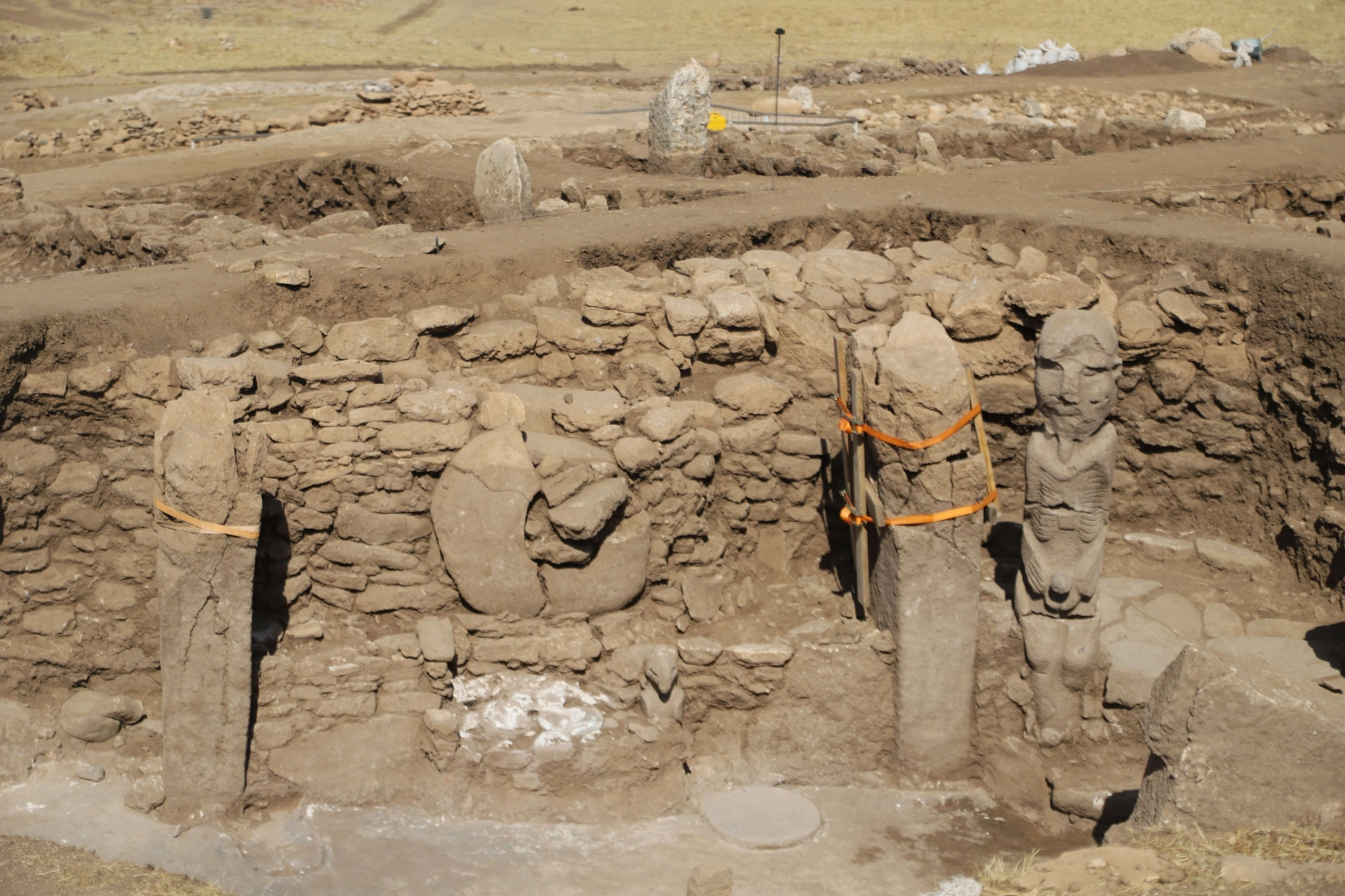 İNSAN HEYKELİ TARİH ÖNCESİ SANATIN EN ETKİLEYİCİ ÖRNEKLERİNDEN Karahantepe’de sürdürülen kazı çalışmalarında ise dönemin en gerçekçi heykellerinden biri gün ışığına kavuşturuldu. Gerçekçi bir yüz ifadesiyle tarih öncesi sanatın en etkileyici örneklerinden biri olmaya aday 2 metre 30 santimetre yüksekliğindeki heykel bir sekinin içerisinde zemine sabitlenmiş olarak bulundu. Ölü bir insanı çağrıştıran kaburga, omurga ve omuz kemiklerinin vurgulandığı oturur vaziyetteki heykelin bulunduğu alanda duvara yerleştirilmiş bir akbaba heykeli ile zemine bırakılmış taş tabaklara ulaşıldı.