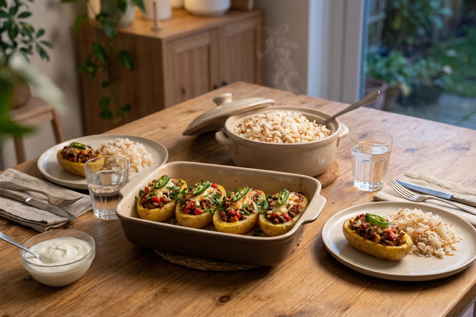 Ön Hazırlık: Ortadan ikiye bölüp içini oyduğun patatesleri hafifçe yağlayıp fırında 200°C'de 15 dakika ön pişirme ile yumuşat.