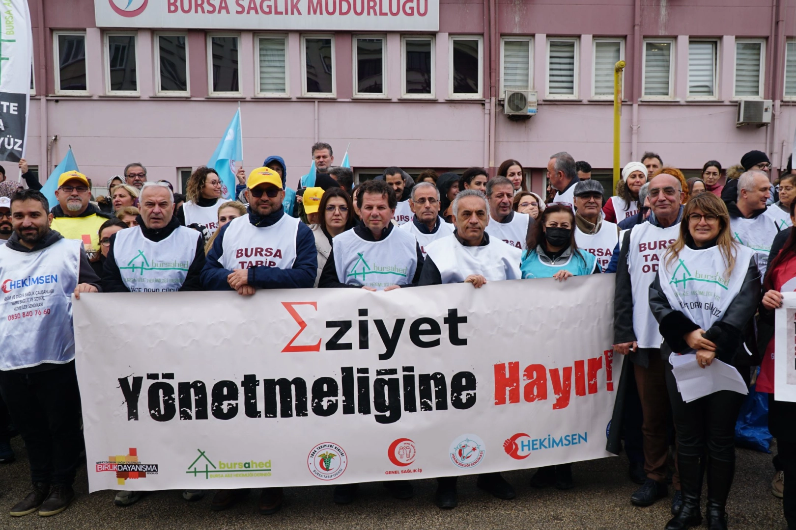 Bursa Tabip Odası (BTO), Genel Sağlık İş Sendikası Bursa Şubesi, HEKİM SEN Bursa Şubesi, Hekimler Birliği Sendikası Bursa Şubesi, Sağlık ve Sosyal Hizmetler Emekçileri Sendikası Bursa Şubesi (SES), Bursa Aile Hekimleri Derneği (BURSAHED) ile Birlik ve Dayanışma Sendikası’nın çağrısıyla Bursa İl Sağlık Müdürlüğü önünde bir araya gelen sağlık çalışanları basın açıklaması gerçekleştirdi.