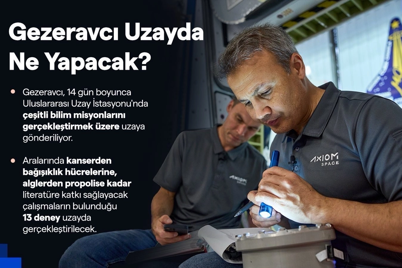 Cumhurbaşkanlığı İletişim Başkanı Fahrettin Altun, sosyal medya hesabından yaptığı paylaşımda ilk Türk uzay yolcusu Alper Gezeravcı’nın yapacağı faaliyetleri açıkladı. Altun, paylaşımında şu ifadelere yer verdi: “Türkiye Yüzyılı vizyonumuz uzaya ulaşıyor. Türkiye'nin Milli Uzay Programı, Cumhurbaşkanımız Sayın Recep Tayyip Erdoğan tarafından 2021 yılında ilan edildi. Bu kapsamda bir vatandaşımızın uzaya gönderilmesi için çalışmalara başlandı. Yapılan değerlendirmeler sonucu Alper Gezeravcı, ilk Türk uzay yolcusu oldu. Gezeravcı, bu gece uzay yolculuğuna başlayacak. Gezeravcı, 14 gün boyunca Uluslararası Uzay İstasyonu’nda çeşitli bilim misyonlarını gerçekleştirmek üzere uzaya gönderilecek. Aralarında kanserden bağışıklık hücrelerine, alglerden propolise kadar literatüre katkı sağlayacak çalışmaların bulunduğu 13 deney uzayda gerçekleştirilecek.”