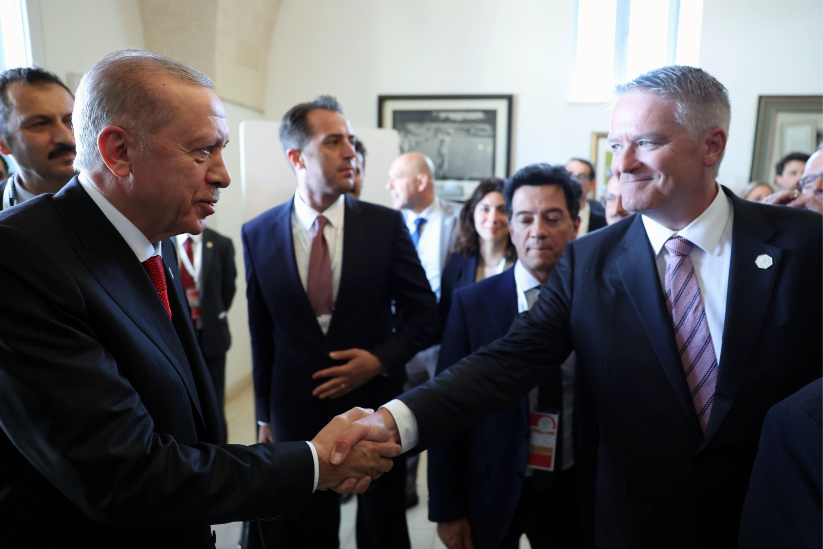 Cumhurbaşkanı Recep Tayyip Erdoğan, İtalya’nın Puglia bölgesindeki Borgo Egnazia'da düzenlenen G7 Devlet ve Hükümet Başkanları Zirvesi'ne katılıyor. Zirve alanına gelen Cumhurbaşkanı Erdoğan, ev sahibi İtalya Başbakanı Giorgia Meloni tarafından karşılandı. Erdoğan zirve öncesi davetli ülkelerin lideriyle ayaküstü sohbet etti.