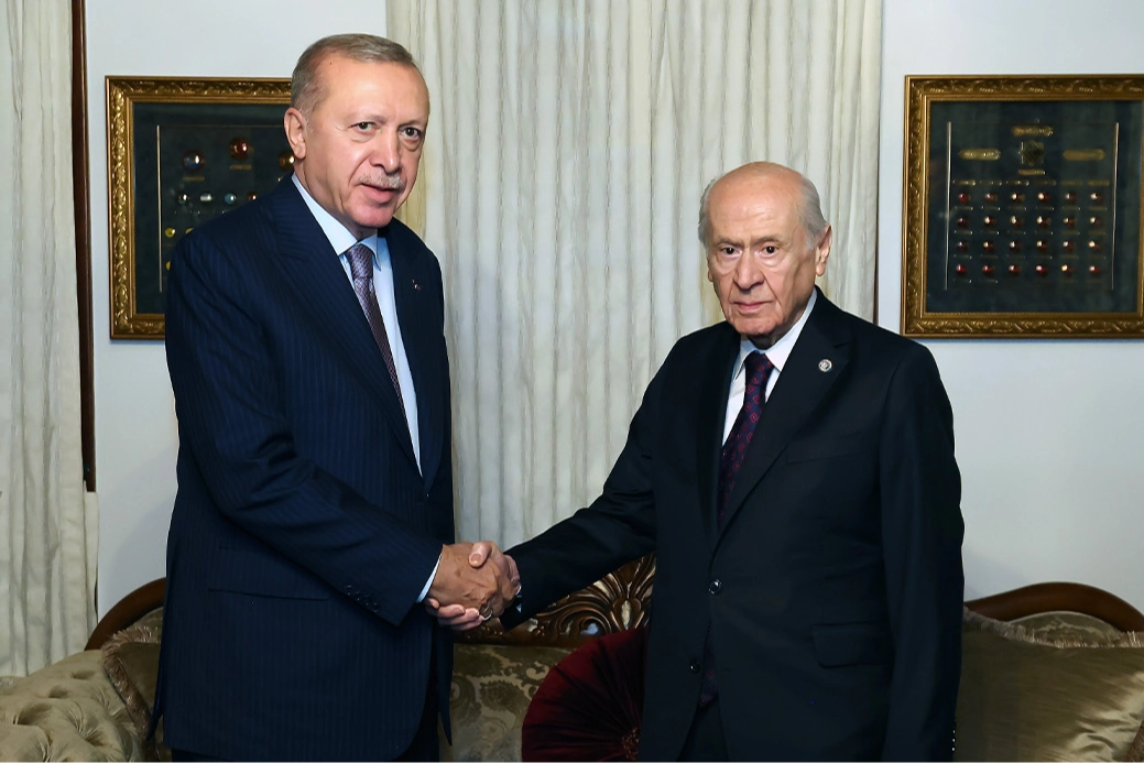 Cumhurbaşkanı Recep Tayyip Erdoğan, Milliyetçi Hareket Partisi (MHP) Genel Başkanı Devlet Bahçeli ile bir araya geldi. Cumhurbaşkanı Recep Tayyip Erdoğan, MHP Genel Başkanı Devlet Bahçeli ile Bahçeli’nin Beytepe’de bulunan evinde bir araya geldi. Bahçeli, Cumhurbaşkanı Erdoğan’ı karşılamak için Beytepe’deki konutunun önüne çıktı. Basına kapalı gerçekleşen görüşme yaklaşık 40 dakika sürdü. Cumhurbaşkanı Erdoğan’a ziyaretinde Cumhurbaşkanlığı İletişim Başkanı Burhanettin Duran ve Cumhurbaşkanlığı Özel Kalem Müdürü Hasan Doğan, Cumhurbaşkanı Dış Politika ve Güvenlik Başdanışmanı Akif Çağatay Kılıç da eşlik etti. Cumhurbaşkanı Erdoğan, MHP Genel Başkanı Bahçeli ile en son eylül ayında Bahçeli’nin konutunda bir araya gelmişti.