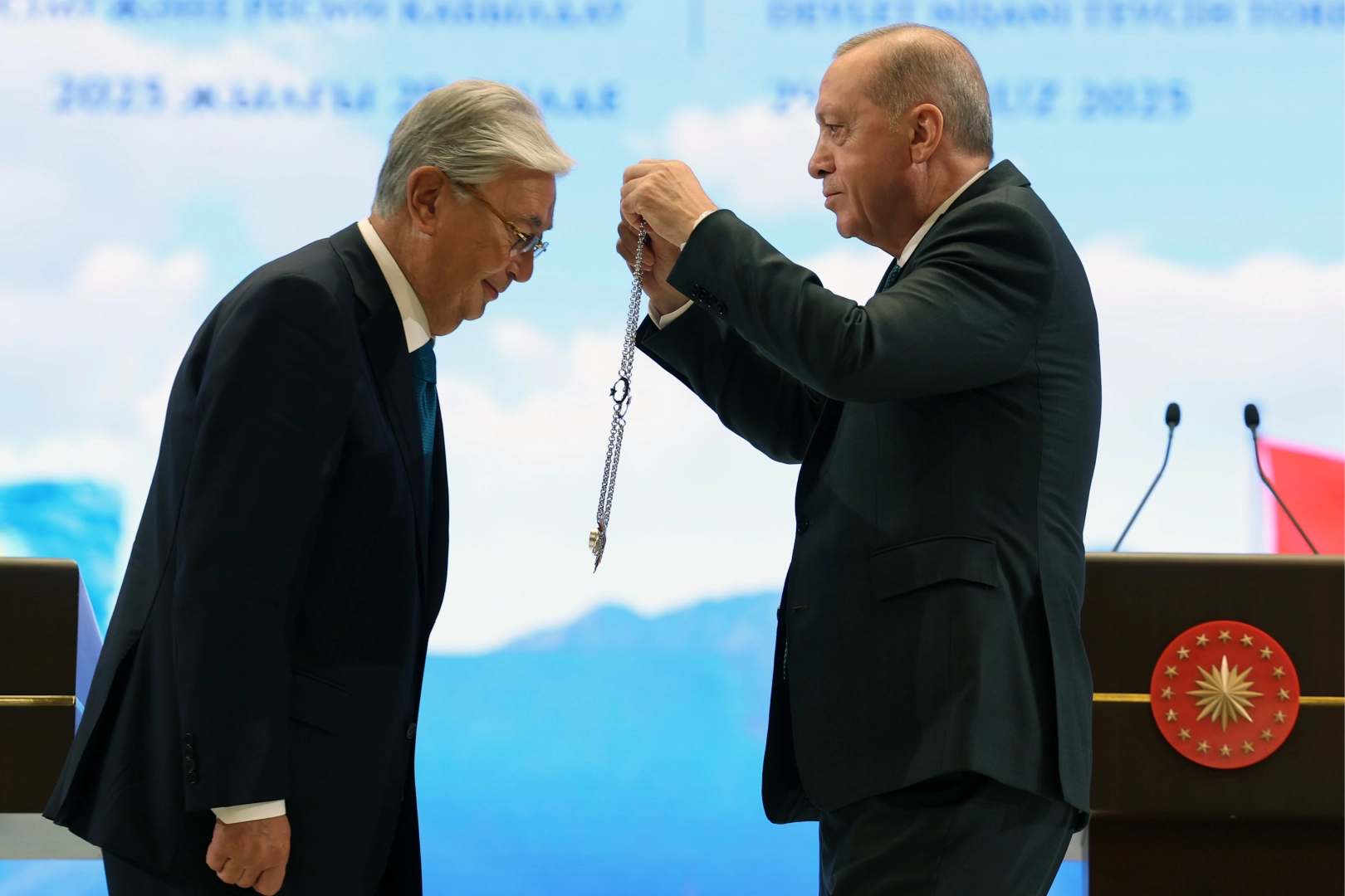 Cumhurbaşkanı Recep Tayyip Erdoğan tarafından Kazakistan Cumhurbaşkanı Kasım Cömert Tokayev’e, Cumhurbaşkanlığı Külliyesi’nde düzenlenen törenle Türkiye Cumhuriyeti Devlet Nişanı tevcih edildi. Törende konuşan Cumhurbaşkanı Erdoğan, Tokayev’in liderliğinde Kazakistan’ın bölgesinde güçlü bir ülke haline geldiğini vurgulayarak, "Kazakistan’ın başarılarından Türkiye olarak, Türk kardeşleri olarak biz de gurur duyuyoruz." ifadelerini kullandı. Cumhurbaşkanı Tokayev’in kendi ülkesinde büyük bir dönüşüme imza atarken, Türkiye-Kazakistan ilişkilerinin güçlenmesine de emek verdiğini kaydeden Cumhurbaşkanı Erdoğan, "Bugün de Yüksek Düzeyli Stratejik İşbirliği Konseyimizin 5. toplantısını başarılı şekilde icra ettik, önemli anlaşmaları akdettik. Kazakistan’ın, Türk Devletleri Teşkilatımızın kurumsallaşmasına yönelik katkılarını da takdirle karşılıyorum" dedi. Türkiye’nin, Kazakistan’ı tanıyan ilk ülke olduğunu hatırlatan Cumhurbaşkanı Erdoğan, iki ülke arasındaki güçlü bağlara işaret ederek, "Bu sene Türkiye-Kazakistan diplomatik ilişkilerinin kuruluşunun 33. yılını idrak ediyoruz. İlişkilerimizin bugünkü mükemmel seviyesine ulaşmasının önünü açan müstesna liderliğinizle, aramızdaki dostluk ve kardeşlik bağlarının daha da güçlendirilmesine yönelik samimi bir irade sergilediniz. Türkiye’nin ve Türk milletinin kara gün dostu olduğunuzu, 6 Şubat depremleri başta olmak üzere son yıllarda defalarca gösterdiniz. İşte tüm bu nedenlerle Türkiye Cumhuriyeti’nin en yüksek nişanı olan Devlet Nişanımızı size tevcih etmekten büyük bir bahtiyarlık duyuyorum. Devlet nişanımızı ülkelerimiz arasındaki sarsılmaz kardeşliğin güçlü bir nişanesi olarak göreceğinize ve taşıyacağınıza inanıyorum" açıklamasını yaptı.