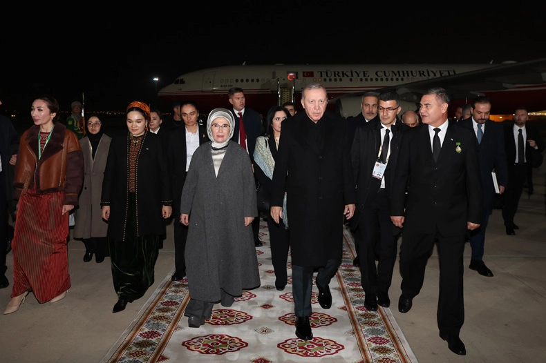 Cumhurbaşkanı Recep Tayyip Erdoğan, 'Uluslararası Barış ve Güven Forumu'na katılmak üzere Türkmenistan'a geldi. Cumhurbaşkanı Recep Tayyip Erdoğan, 'Uluslararası Barış ve Güven Forumu'na katılmak üzere Türkmenistan'ın başkenti Aşkabat'a geldi. Erdoğan, Aşkabat Uluslararası Havalimanı'nda, Türkmenistan Başbakan Yardımcısı Mammethan Çakıyev ve Türkiye'nin Aşkabat Büyükelçisi Ahmet Demirok ile diğer ilgililer tarafından karşılandı. Cumhurbaşkanı Erdoğan'a, Türkmenistan ziyaretinde eşi Emine Erdoğan, Dışişleri Bakanı Hakan Fidan ile Enerji ve Tabii Kaynaklar Bakanı Alparslan Bayraktar eşlik ediyor.