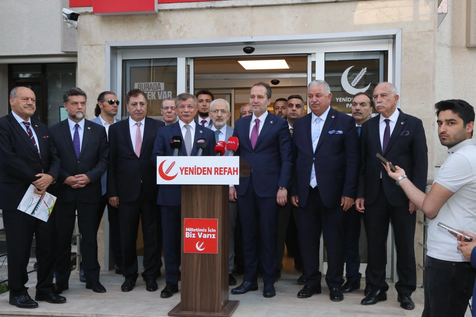 Gelecek Partisi Genel Başkanı Ahmet Davutoğlu, beraberindeki heyetle Yeniden Refah Partisi Genel Başkanı Fatih Erbakan’ı parti genel merkezinde ziyaret etti. Yaklaşık 1,5 saat süren görüşme sonrası iki lider basın mensuplarına açıklamada bulundu. Konuşmasına Davutoğlu’na teşekkür ederek başlayan Erbakan, “Bu sohbet esnasında elbetteki iki siyasi parti olarak 31 Mart yerel seçimlerini ve bir önceki 14-28 Mayıs genel seçimlerini ve bunların sonuçlarını değerlendirme imkanını bulduk. İktidar 31 Mart’ta neden böyle bir yenilgiye uğradı, muhalefetin başarısı neye dayanıyor ve bundan sonra nasıl gelişmeler olabilir, bunlar üzerine istişare ve müzakere yapıldı. Bununla beraber yeni Anayasa konusunda ve Türkiye’nin en önemli problemi olarak ifade edebileceğimiz ekonomik kriz ve yoksulluk noktasında bir değerlendirme yapıldı. Yine bütün bunlarla birlikte hepimizin ortak yarası olan Gazze’de ve Refah’ta yapılan katliamlar ve soykırımla ilgili Türkiye ve İslam aleminin atabileceği adımlar görüşüldü” dedi. Davutoğlu ise, “Yeniden Refah Partisi ile kurulduğumuz andan beri istişare zemini hep oldu. Sık sık görüştük. Bugün gerçekleştirdiğimiz görüşmede birçok hususu ele alma imkanı oldu. 31 Mart seçimlerinin çıkardığı tabloyu detaylı olarak ele aldık. Bu siyasi tabloda iktidar partisinin yaşadığı yenilgi sonrasında iktidar ve muhalefet cenahında ortaya çıkan gelişmeleri, Türkiye’nin genel siyasi gidişatı açısından ele aldık. Önümüzdeki dönem Türkiye’deki siyasi denklemin yeniden kurulduğu bir dönemdir” ifadelerini kullandı.