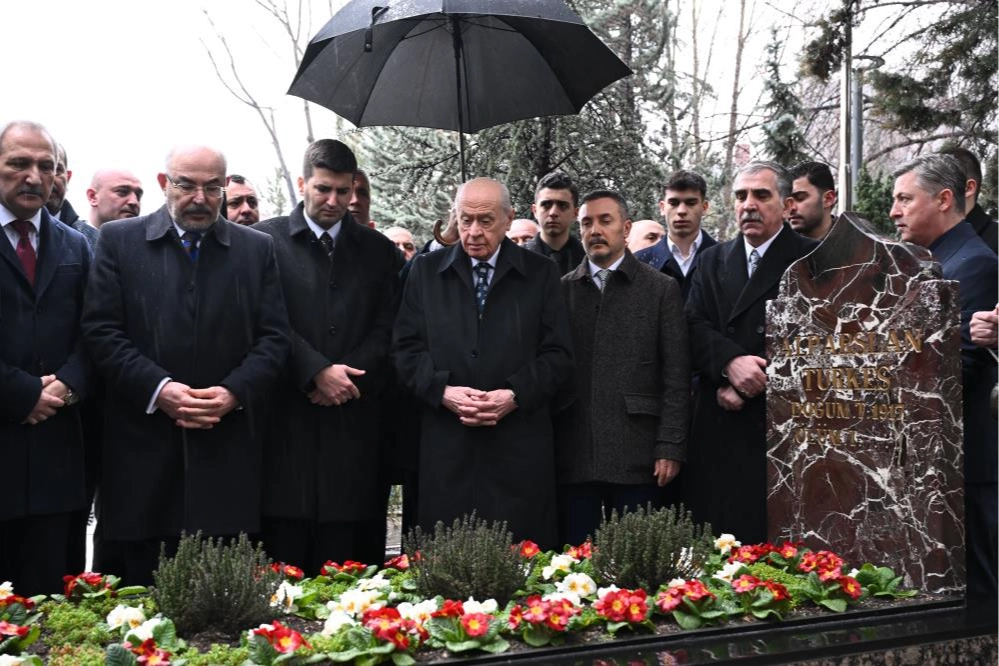 Milliyetçi Hareket Parti (MHP) Genel Başkanı Devlet Bahçeli, Bayram namazı sonrası MHP'nin kurucu genel başkanı merhum Alparslan Türkeş'in kabrini ziyaret etti. Ziyaretin ardından gazetecilere açıklamalarda bulunan Bahçeli, "Bayram sonrası yeni ve güçlü bir Türkiye'nin adımları atılacak" dedi. MHP lideri Bahçeli, Bayram namazı sonrası MHP kurucu lideri merhum Alparslan Türkeş'in kabrini ziyaret etti. Bahçeli ve beraberindeki partililer Türkeş'in kabrine karanfil bırakarak dua etti, Ziyaretin ardından gazetecilere açıklamalarda bulunan Bahçeli, şunları dedi: "Mübarek Ramazan ayını milletçe geçirmiş bulunduk. Şimdi bayramı idrak etmekteyiz. Bayramı üzüntülü bir şekilde karşılamaktayız. Ülkemizdeki çevresindeki gelişmeler çok yönlü siyasi çatışmaların dışında ülkeler arasında çatışmaların yaygınlaştığı bir ortamda yeni bir bayram dönemine girmekteyiz. Öncelikle Türk milletine İslam alemine ve bütün insanlığa bayramın hayırlı olmasını niyaz ediyorum. Önümüzdeki dönem, Bayram sonrası yeni ve güçlü bir Türkiye'nin inşasında önemli hizmetlerin ve adımların atılacağı bir dönem olacaktır. Burada en önemli mesele varolan siyasi partilerimizin bütünüyle, Meclis'te temsil edilen partilerin verimli ve etkin çalışmalarıyla, Türkiye'nin tüm meselelerini çözebilecek bir görüş birliğiği, ağız birliğinde olmalarını temmeni ediyorum. Hepinizi sevgi ve saygıyla selamlıyorum."