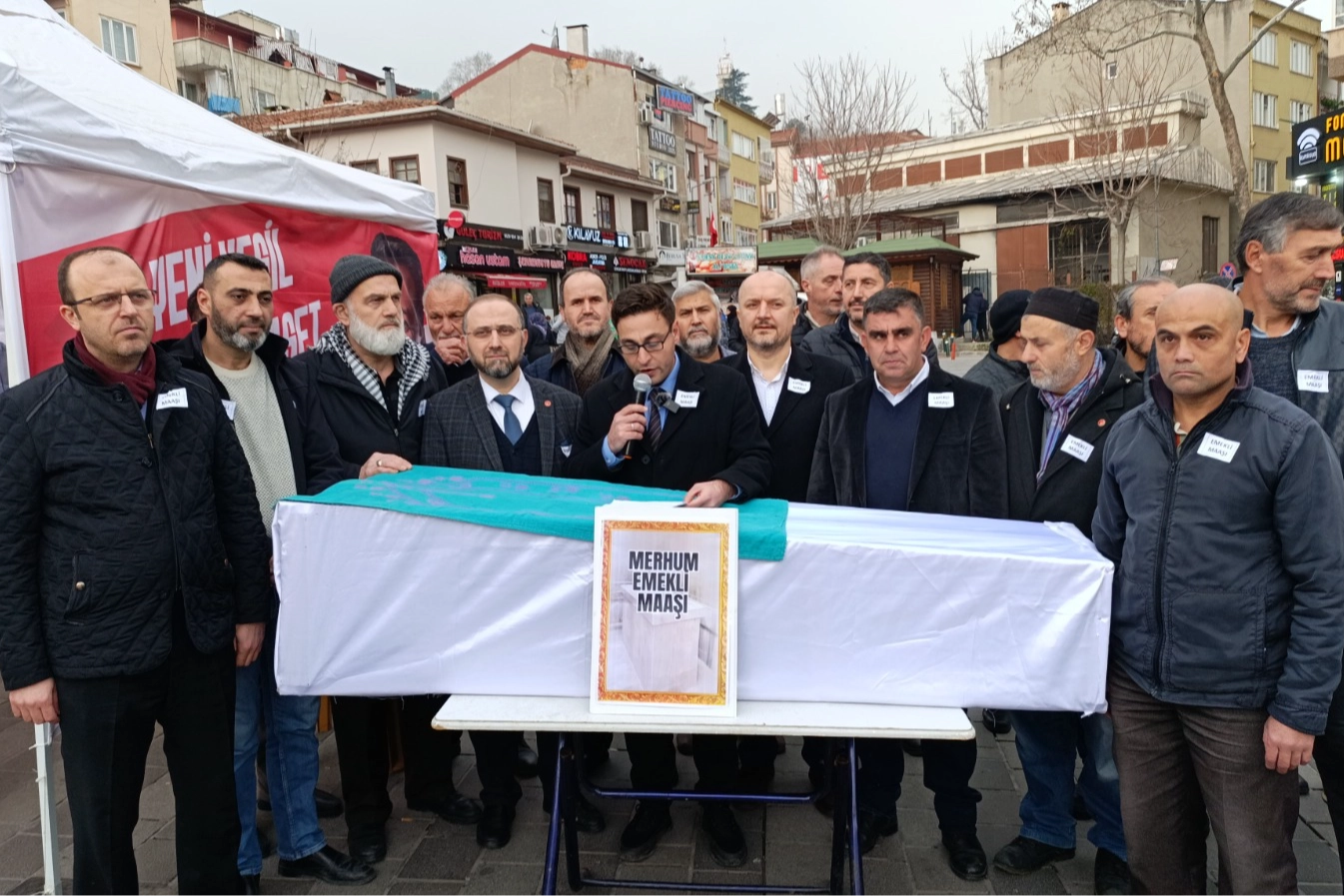 Saadet Partisi Osmangazi İlçe Başkanlığı Emekli Maaşlarına verilen zamları tabutla protesto etti.