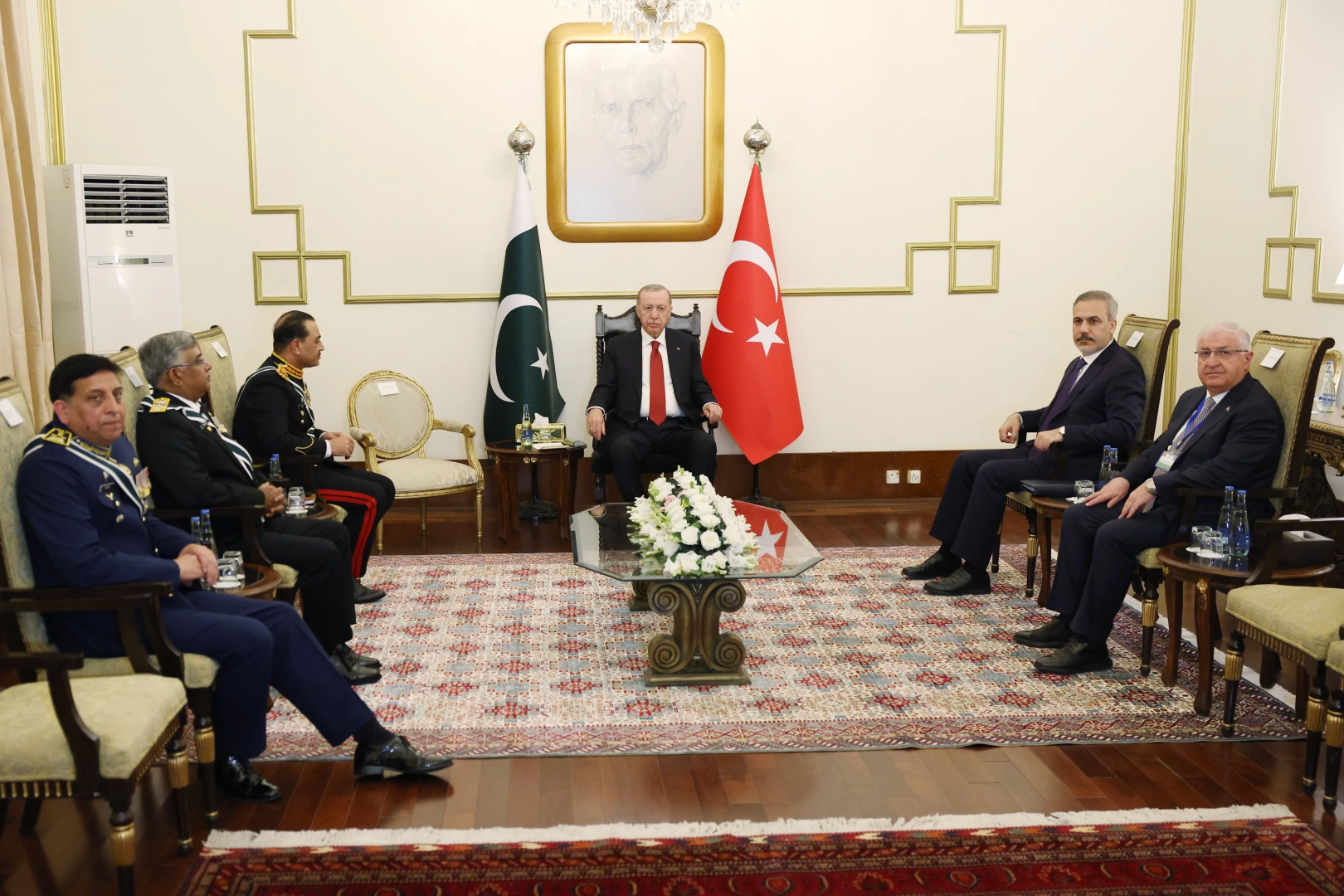 Cumhurbaşkanı Recep Tayyip Erdoğan, resmi ziyaret düzenlediği Pakistan'da temaslarını sürdürüyor. Cumhurbaşkanı Erdoğan, Pakistan Kara Kuvvetleri Komutanı Syed Asim Munir, Deniz Kuvvetleri Komutanı Naveed Ashraf ve Hava Kuvvetleri Komutanı Zaheer Ahmad Baber Sidhu'yu kabul etti. Kabulde, Dışişleri Bakanı Hakan Fidan ile Milli Savunma Bakanı Yaşar Güler de hazır bulundu.