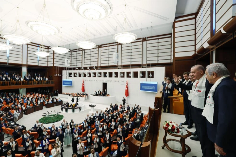 Tören mangasını selamlayan Cumhurbaşkanı Erdoğan, Meclis'e girişinde Filistin Devlet Başkanı Mahmud Abbas ile bir süre sohbet etti. Cumhurbaşkanı Erdoğan, Filistin Devlet Başkanı Abbas ve TBMM Başkanı Numan Kurtulmuş ile fotoğraf çektirdi. Daha sonra TBMM Genel Kurul Salonu'ndaki yerini alan Cumhurbaşkanı Erdoğan, Filistin Devlet Başkanı Abbas’ın konuşmasını takip etti.