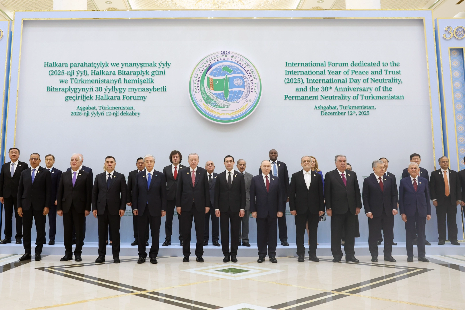 Cumhurbaşkanı Recep Tayyip Erdoğan, Uluslararası Barış ve Güven Forumu'na katılmak üzere geldiği Aşkabat’ta forum öncesi Türkmenistan Cumhurbaşkanı Serdar Berdimuhamedov tarafından karşılanmasının ardından aile fotoğrafı çekimine katıldı. Cumhurbaşkanı Recep Tayyip Erdoğan, Uluslararası Barış ve Güven Forumu'na katılmak üzere geldiği dün akşam saatlerinde geldiği Türkmenistan'ın başkenti Aşkabat'ta temaslarına başladı. Cumhurbaşkanı Erdoğan, davetli devlet ve hükûmet başkanlarıyla birlikte Tarafsızlık Anıtı'na çelenk koyma törenine katıldı. Cumhurbaşkanı Erdoğan, çelenk koyma töreninin ardından "Uluslararası Barış ve Güven Forumu öncesinde, forumun yapıldığı Türkmenistan Maslahatlar Merkezi'ne geçti. Burada Türkmenistan Devlet Başkanı Serdar Berdimuhamedov tarafından karşılanan Cumhurbaşkanı Erdoğan, Berdimuhamedov ile tokalaşarak fotoğraf çektirdi. Karşılama töreninin ardından aile fotoğrafı çekimine geçildi. Aile fotoğrafı çekiminde Cumhurbaşkanı Erdoğan’ın sağında Kazakistan Cumhurbaşkanı Kasım Cömert Tokayev ve solunda ise Türkmenistan Devlet Başkanı Serdar Berdimuhamedov yer aldı. Cumhurbaşkanı Erdoğan bugünkü Türkmenistan temasları kapsamında ikili görüşmelerde bulunacak. Uluslararası forum katılımcılarının onuruna verilecek yemeğe katılacak.