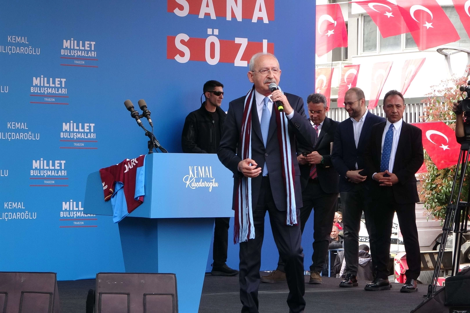 CHP liderini konuşmasını yapmak üzere kürsüye Ekrem İmamoğlu anons ederek davet ederken, kendisine 13 numaralı üzerinde Kemal Kılıçdaroğlu’nun isminin yazılı Trabzonspor forması ile kasket hediye etti. Kemal Kılıçdaroğlu da konuşmasına AFAD’ın yaptığı fırtına uyarısına vurgu yaparak başladı. Kılıçdaroğlu, “Bu ülkenin birleşmeye ihtiyacı var. Bu ülkenin huzura ihtiyacı var. Bu ülkenin beraber olmaya ihtiyacı var. Bu ülkenin kucaklaşmaya ihtiyacı var. Bu ülkede kavgadan bıkmadık mı? Sağdır soldur dedik birbirimiz öldürdük. Bundan bıkmadık mı? Artık başı açık, başı kapalı diye kadınları ayırdık bu ayrımcalıktan bakmadık mı? Söz veriyorum söz. Trabzon’a söz Türkiye’ye söz, bitireceğim ayrımcılığı. 85 milyonu kucaklaştıracağım, 85 milyonu. Bir arada olacağız, beraber olacağız ve güzel Türkiye’yi yeniden inşa edeceğiz. Göreceksiniz, hayatın her aşamasında göreceksiniz” ifadelerini kullandı.
