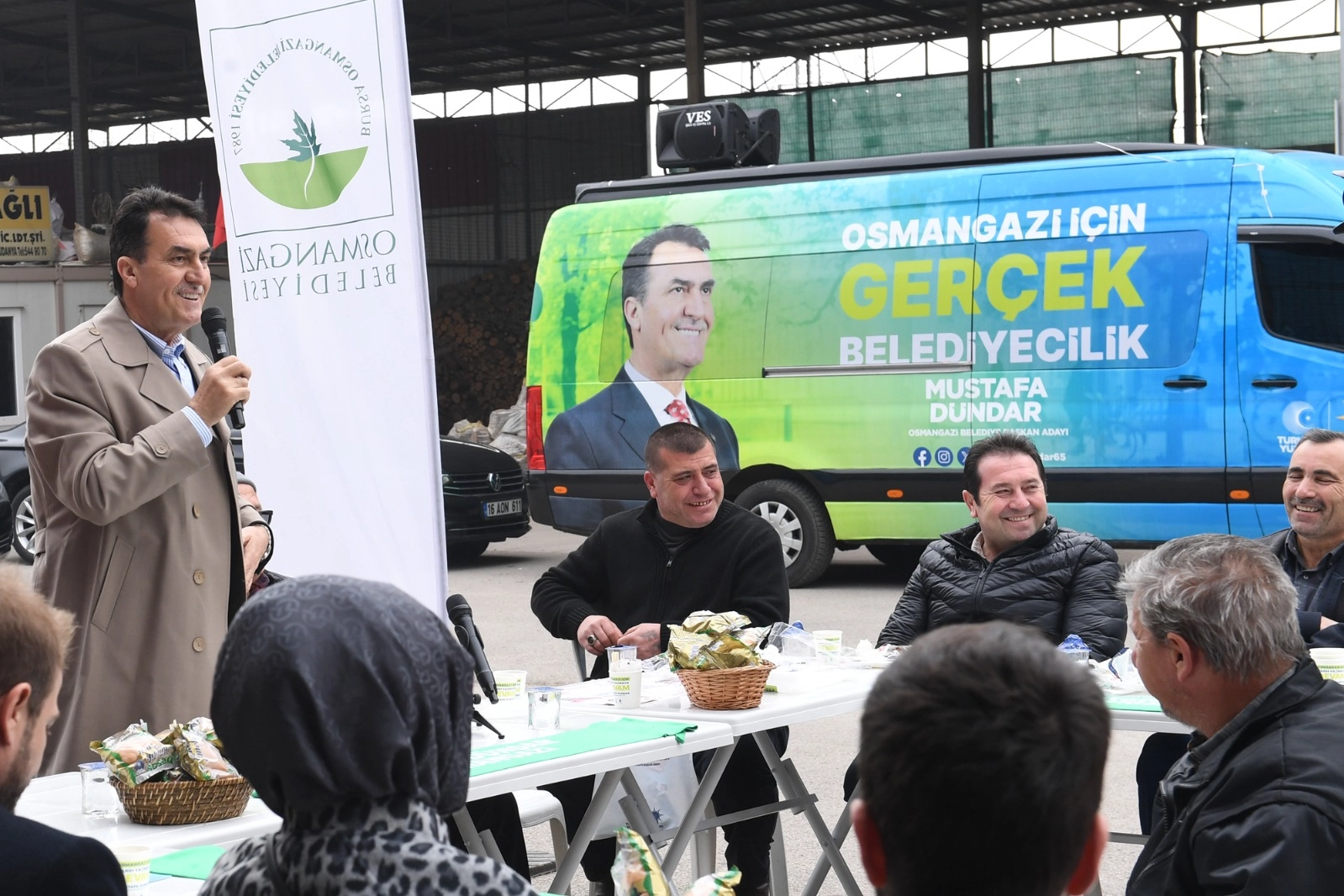 Bursa Mahrukatçılar Derneği Başkanı İbrahim Kurt, ziyaretinden dolayı Dündar’a teşekkürlerini sunarak, “Osmangazi, Türkiye’de borcu olmayan ender belediyelerdense; bu, dürüstçe ve mertçe çalışan Mustafa Dündar sayesindedir. Mustafa Başkanımız Bursa’ya çok önemli eserler kazandırdı. Panorama 1326 Bursa Fetih Müzesi ve Osmangazi Meydanı gibi eserler şehrimize büyük değer kattı. Başkanımız bu görevi başarıyla yürütüyor. İnşallah görevini 31 Mart tarihinden sonra da sürdürecektir. Bursa Mahrukatçılar Sitesi, Türkiye’deki diğer mahrukatçılar için örnek bir yer oldu. Soğanlı Millet Bahçesi inşaatı dolayısıyla bizler o bölgeden taşınmak durumunda kaldık. İlk etapta biraz canımız sıkıldı ancak şimdi orada ortaya çıkan eseri görünce gurur duyuyoruz. Bizim desteğimiz Mustafa Başkanımızdan yana. Allah çıktığı yolda kendisini mübarek eylesin” dedi.