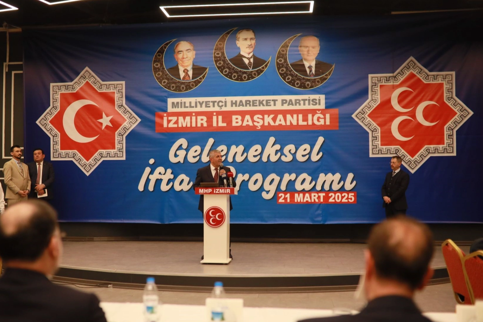 Yaşananlara böyle bakıyoruz. Bizim bu konuda tavrımız nettir; Türk yargısına güvenimiz sonsuzdur. Hiç kimse dokunulmaz, ulaşılmaz ve erişilmez değildir. Hiç kimsenin suç işleme özgürlüğü yoktur. Hiç kimse seçildim diye bu ülkede arsızlık yapma, hırsızlık yapma ve yolsuzluk yapma hakkına sahip değildir" ifadelerini kullandı. MHP İzmir İl Başkanlığının tertip ettiği Geleneksel İftar Programı Cumhur İttifakı buluşmasına sahne oldu. Programda, MHP ve AK Parti milletvekilleri, Belediye Başkanları, üniversitelerin temsilcileri, STK başkan ve temsilcileri, sendikalar ve Ülkü Ocaklılar ile birlikte 2 bin MHP'li yer aldı. MHP İzmir'in İl Yönetim Kurulu üyelerinin, 30 ilçe teşkilatı yöneticilerinin, Belediye Meclis Üyelerinin, Ülkü Ocakları'nın ve Türkiye Kamu Çalışanları Vakfı Şube Başkanlarının tüm kadrolarıyla katıldığı iftar yemeğine AK Parti Genel Sekreteri ve İzmir Milletvekili Eyyüp Kadir İnan, AK Parti İzmir Milletvekili Yaşar Kırkpınar, İl Başkanı Bilal Saygılı, Menemen Belediye Başkanı Aydın Pehlivan da davetliler arasındaydı. MHP İzmir Milletvekili ve Genel Sekreter Yardımcısı Tamer Osmanağaoğlu, MHP'nin üç dönemdir seçim kazandığı Aliağa'da Belediye Başkanlığını yürüten Serkan Acar da programda yerini aldı. MHP İzmir'in Geleneksel İftar Programına EBSO Başkan Vekili Hakan Ürün, Ticaret Borsası Meclis Başkanı Ömer Gökhan Tuncer, Başkan Yardımcısı Ercan Korkmaz, İzmir Esnaf ve Sanatkarlar Odaları Birliği Başkanı Yalçın Ata ve yöneticileri ile birlikte çok sayıda üst düzey protokol katıldı. "Kimsenin suç işleme özgürlüğü yok" İftar programının açılış konuşmasını yapan MHP İzmir İl Başkanı Veysel Şahin, yaşanan İmamoğlu ve İstanbul Büyükşehir Belediyesi soruşturması ile ilgili olarak, "Bizim bu konuda tavrımız nettir; Türk yargısına güvenimiz sonsuzdur. Hiç kimse dokunulmaz, ulaşılmaz ve erişilmez değildir. Hiç kimsenin suç işleme özgürlüğü yoktur. Hiç kimse seçildim diye bu ülkede arsızlık yapma, hırsızlık yapma ve yolsuzluk yapma hakkına sahip değildir" ifadelerini kullandı. "CHP devlet vadetti, ABD özgürlük" MHP İl Başkanı Şahin, "ABD'nin Kürt kardeşlerimizi bizden koparmak için özgürlük vadediyorum dediği ve CHP'li Özgür Özel'in devlet vadediyorum dediği dönemde liderimizin başlattığı, 'Terörsüz Türkiye' projesi kardeşliğimiz ve birliğimiz açısından büyük bir adım olmuştur. Liderimiz Devlet Bahçeli Beyefendi; 'Süreç yok! Müzakere yok! Demokratik dönüşüm yok! Açılım yok! Hapisteki teröristler, Kandil'deki katiller üzerinde oyun kurmak yok! Kayıtsız şartsız örgütün lağvedilmesi, ya silahlar gömülecek ya da silahlarıyla birlikte gömülecek' diyerek sarsılmaz bir irade ortaya koyması büyük Türk Devleti adına büyük bir adım olmuştur" dedi.