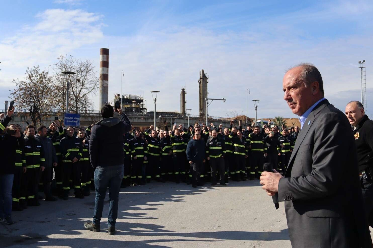 2022’de yüzde bin 135 kar etmiş firmanın TÜPRAŞ işçisinin emeğini gasp ettiğini ifade eden Muharrem İnce, “Türkiye’nin en önemli tesislerinden birinin önünde olduğumu biliyorum. Burada grev hakkı yok diye, stratejik bir tesis diye 2021’e göre 2022’de yüzde 1135 kar etmiş bir şirket resmen emeği gasp etmektedir. Hafta sonu izinlerinize mesai yazıldığını da biliyorum. Ek zam talebinizin, enflasyon farkını alamadığınızı da biliyorum. Aynı sektörde çalışanlarla sizin ücretlerinizin yarı yarıya düşük olduğunu da biliyorum. Bunların hepsini biliyorum. Bunların takipçisi olacağız. Bazı şeylere güvenerek yüzde 1135 kar etmiş bir kurum kimsenin hakkını yememeli. Yedirmeyeceğiz, yanınızda olacağız” diye konuştu.