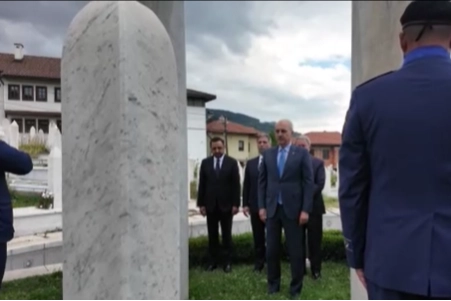 TBMM Başkanı Numan Kurtulmuş, Bosna Hersek'in ilk Cumhurbaşkanı Aliya İzzetbegoviç'in kabrini ziyaret etti. TBMM Başkanı Numan Kurtulmuş, Srebrenitsa Soykırımını Uluslararası Düşünme ve Anma Günü programlarına katılmak ve resmi temaslarda bulunmak üzere geldiği Bosna Hersek'in başkenti Saraybosna’da Kovaçi Şehitliği'ni ziyaret etti. Şehitliğe gelişinde Meçhul Asker Anıtı önünde dua eden Kurtulmuş, daha sonra Cumhurbaşkanı Aliya İzzetbegoviç'in mezarına üzerinde "TBMM Başkanı" yazılı çelenk bıraktı. Ziyarette ayrıca Kur’an-ı Kerim okunarak, dua edildi.