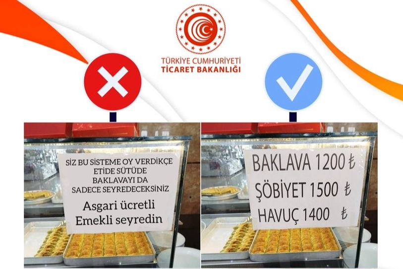 Ticaret Bakan Yardımcısı Mahmut Gürcan, sosyal medya hesabından yaptığı paylaşımda, 21 Temmuz tarihinde sosyal medya platformunda paylaşılan ve üzerinde "Siz bu sisteme oy verdiğiniz sürece eti de, sütü de, baklavayı da sadece seyredeceksiniz. Asgari ücretli, emekli seyredin" ifadelerinin yer aldığı tatlı tezgâhı görseliyle ilgili olarak, "Ticaret Bakanlığımıza bağlı İl Müdürlüğümüzce derhal inceleme başlatılmıştır" dedi. Gürcan, yapılan ilk değerlendirmede söz konusu görsel üzerinde dijital müdahale yoluyla oynama yapıldığı yönünde bulgular elde edildiğini belirterek, "Bu çerçevede ilimiz genelinde faaliyet gösteren ‘A.G' unvanlı tüm işletmelerde eş zamanlı denetimler gerçekleştirilmiştir. Denetimler sonucunda sosyal medyada paylaşılan görüntünün Nurdağı-Gaziantep Otoyolu üzerinde faaliyet gösteren ‘D.M.U Tesisi' bünyesindeki bir işletmede çekildiği tespit edilmiştir. Firma yetkilileriyle yapılan görüşmede, söz konusu görselin gerçeği yansıtmadığı, bu tür içeriklerin firmanın ticari itibarını zedelediği ve bu nedenle ilgili kişiler hakkında yasal yollara başvurulacağı ifade edilmiştir" ifadelerini kullandı. "BU VE BENZERİ İÇERİKLERLE İLGİLİ GEREKLİ HUKUKİ SÜREÇLER İLGİLİ KURUMLARIMIZLA KOORDİNASYON İÇİNDE BAŞLATILACAKTIR" Gürcan, şunları kaydetti: "Paylaşılan fotoğraftaki ifadelerin ilgili işletmede bulunmadığı, görselin fiyat tarifesine dijital müdahale ile sonradan eklemeler yapıldığı, sosyal medya üzerinden kamuoyunda algı oluşturma amacı güdüldüğü tutanak altına alınarak, fotoğraflarla belgelenmiştir. Bu tür yanıltıcı paylaşımlar; tüketici ile üretici arasında güven zedelenmesine, haksız ticari itibar kaybına, kamuoyunda gerçek dışı algı oluşmasına neden olmaktadır. Ticaret Bakanlığı olarak hem tüketiciyi hem de işletmeleri korumak amacıyla sahadaki ve dijital ortamdaki denetimlerimizi aralıksız sürdürüyor; gerçeğe dayalı bilgiyle kamuoyunu doğru şekilde aydınlatmaya devam ediyoruz. Bu ve benzeri içeriklerle ilgili gerekli hukuki süreçler ilgili kurumlarımızla koordinasyon içinde başlatılacaktır."
