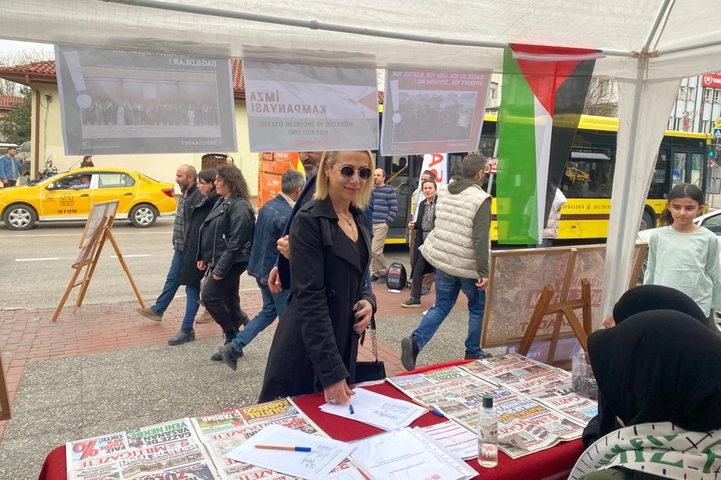 İsrail terör devletinin Filistin’de yaptığı insanlık dışı soykırıma karşı Bursa Yıldırım ilçesi Setbaşı meydanında stant açarak imza kampanyası düzenlediler.