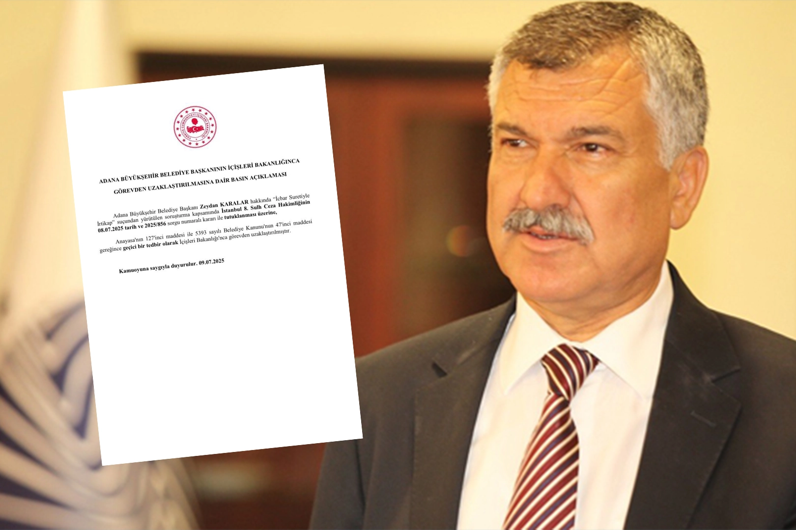 İçişleri Bakanlığı, Adana Büyükşehir Belediye Başkanı ve Büyükçekmece Belediye Başkan Vekilinin görevden uzaklaştırılmasına ilişkin basın açıklamasında bulundu. İçişleri Bakanlığı, Adana Büyükşehir Belediye Başkanı Zeydan Karalar’ın ‘İcbar Suretiyle İrtikap’ suçundan yürütülen soruşturma kapsamında İstanbul 8. Sulh Ceza Hakimliğinin kararı ile tutuklanması üzerine İçişleri Bakanlığınca geçici olarak görevden uzaklaştırıldı. Büyükçekmece Belediye Başkan Vekili Ahmet Şahin ise ‘Suç İşlemek Amacıyla Örgüte Üye Olma ve Rüşvet Almak’ suçundan yürütülen soruşturma kapsamında İstanbul 4. Sulh Ceza Hakimliğinin kararı ile tutuklanması üzerine İçişleri Bakanlığınca geçici olarak görevden uzaklaştırıldı.