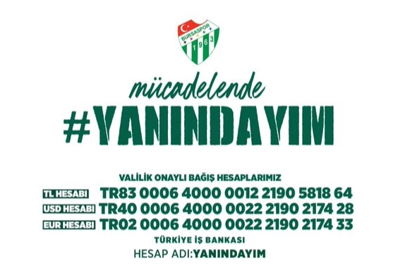 Bursaspor Kulübü, 'Yanındayım' kampanyasına ismi açıklanmayan ancak Başkan Enes Çelik'in Ankaralı arkadaşı olduğu belirtilen bir iş insanının 2 milyon 500 bin TL destek verdiğini açıkladı.