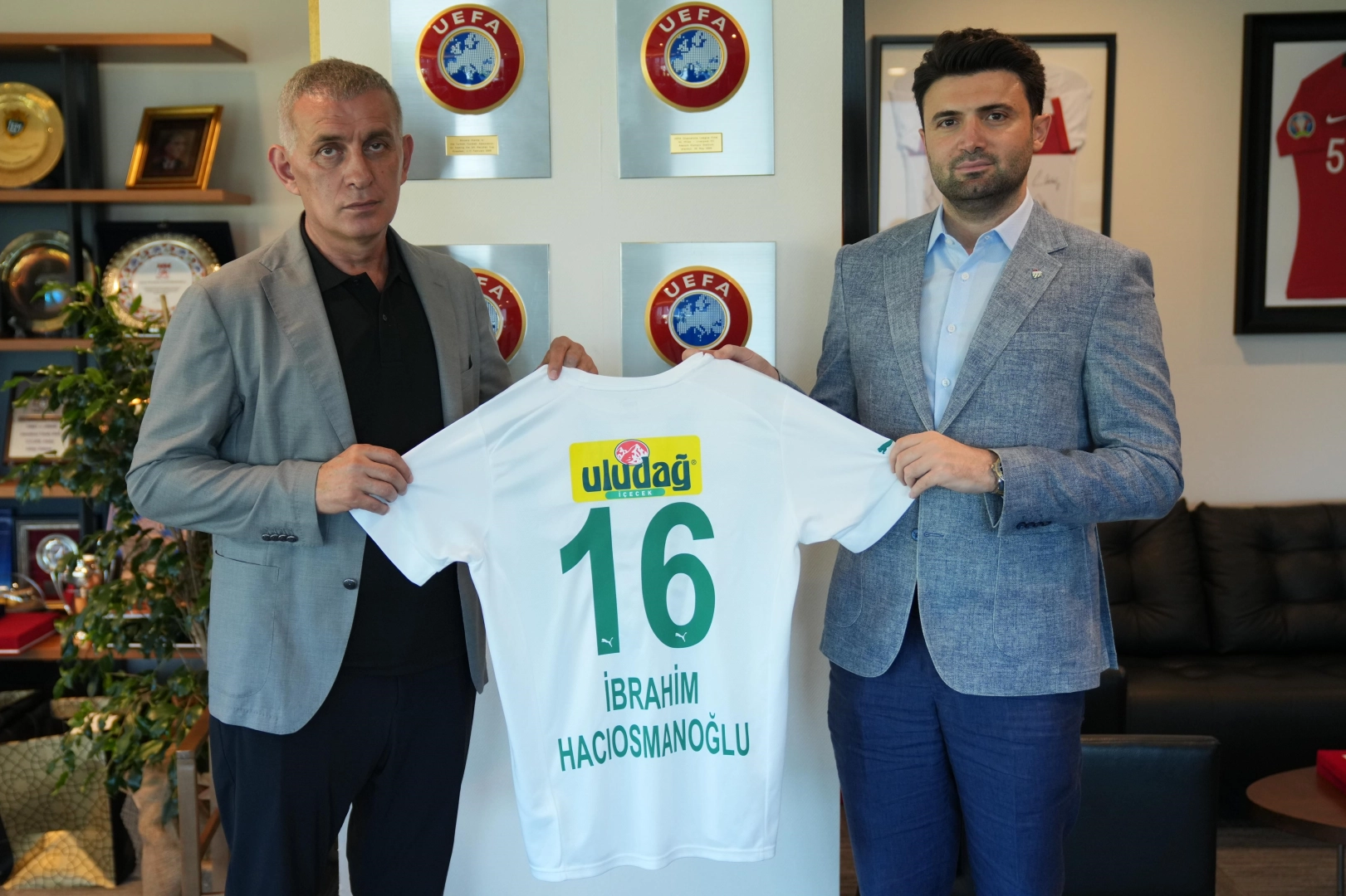 Bursaspor Başkanı Enes Çelik, Türkiye Futbol Federasyonu (TFF) Başkanı İbrahim Hacıosmanoğlu’nu makamında ziyaret etti. Çelik, Hacıosmanoğlu’na 16 numaralı Bursaspor forması hediye etti. Bursaspor Başkanı Enes Çelik, önemli bir ziyarete imza attı. Yeşil-beyazlı kulübün Başkanı Çelik, Türkiye Futbol Federasyonu Başkanı İbrahim Hacıosmanoğlu’nu ziyaret etti. Gerçekleşen ziyarette Başkan Enes Çelik, TFF Başkanı İbrahim Hacıosmanoğlu ve ekibine yeni görevlerinde başarılar diledi. Bursaspor’un son durumu ile ilgili de görüş alışverişinin bulunulduğu görüşme sonrası Enes Çelik, İbrahim Hacıosmanoğlu’na 16 numaralı Bursaspor forması hediye etti. TFF Başkanı Hacıosmanoğlu da 10 numaralı Milli Takım formasını Çelik’e takdim etti.