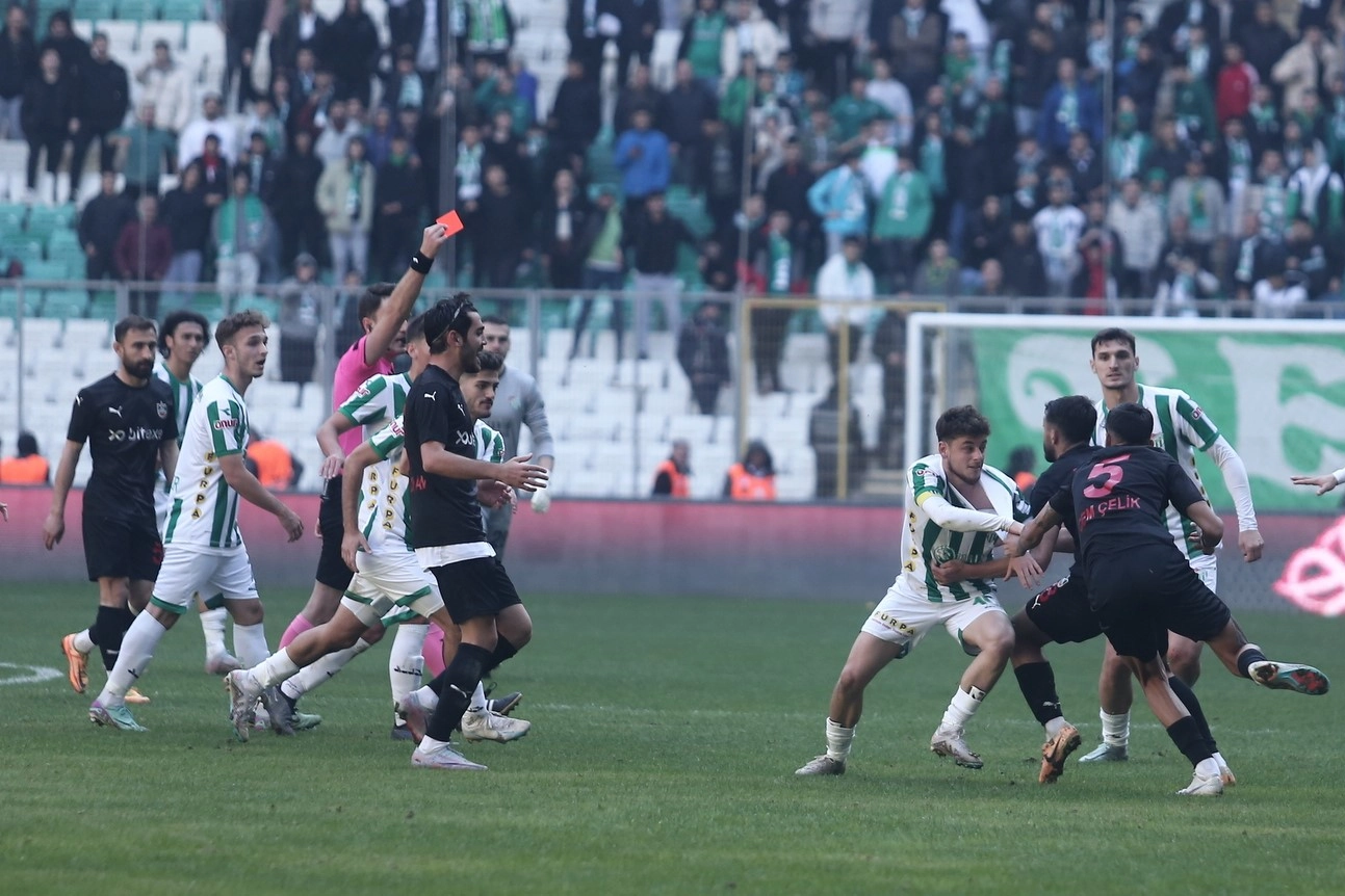 Hakem Burak Taşkınsoy, Çağatay Yılmaz’a kırmızı kart gösterince futbolcular arasında arbede çıktı. Olaylar sonrasında Diyarbekirspor’dan Serhat Çalışkan, Cem Celik ve Bünyamin Yürür, Bursaspor’dan ise Çağatay Yılmaz ile Bilal Güney kırmızı kartla cezalandırıldı.