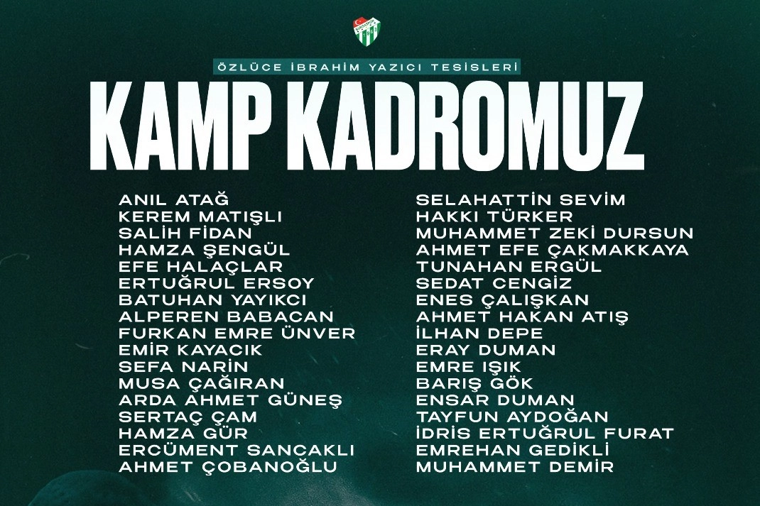 Bursaspor Kulübü'nün, Özlüce'de başlayacak sezon hazırlıkları için 33 kişilik kamp kadrosu açıklandı. Yeni sezona iddialı bir kadroyla hazırlanan Bursaspor’da kamp çalışmaları öncesi kadro netleşti. Teknik direktör Adem Çağlayan yönetimindeki yeşil-beyazlılar, Özlüce İbrahim Yazıcı Tesisleri'nde toplanarak hazırlıklara start verecek. Yönetimin transfer döneminde kadroya kattığı 11 futbolcunun da kamp kadrosunda yer alması dikkat çekti. Takımın iskeletini oluşturan tecrübeli isimlerin yanı sıra genç oyuncular da listede kendine yer buldu. Kamp kadrosunda yer alan 33 isim ise şöyle: Kaleciler: Anıl Atağ, Selahattin Sevim, Hakkı Türker Defans: Kerem Matişli, Salih Fidan, Hamza Şengül, Efe Halaçlar, Ertuğrul Ersoy, Batuhan Yayıkçı, Alperen Babacan, Furkan Emre Ünver, Emir Kayacık, Sefa Narin, Tunahan Ergül, Ahmet Çobanoğlu, İdris Ertuğrul Furat Orta saha: Musa Çağıran, Arda Ahmet Güneş, Sertaç Çam, Hamza Gür, Ercüment Sancaklı, Ahmet Efe Çakmakkaya, Sedat Cengiz, Enes Çalışkan, Ahmet Hakan Atış, İlhan Depe, Tayfun Aydoğan, Barış Gök Forvet: Eray Duman, Emre Işık, Ensar Duman, Emrehan Gedikli, Muhammet Demir Genç teknik adam Adem Çağlayan’ın ilk kamp deneyimi olacak bu süreçte, takım içi uyum ve fiziksel hazırlık ön planda tutulacak. Kamp boyunca birçok hazırlık maçı da planlanıyor.