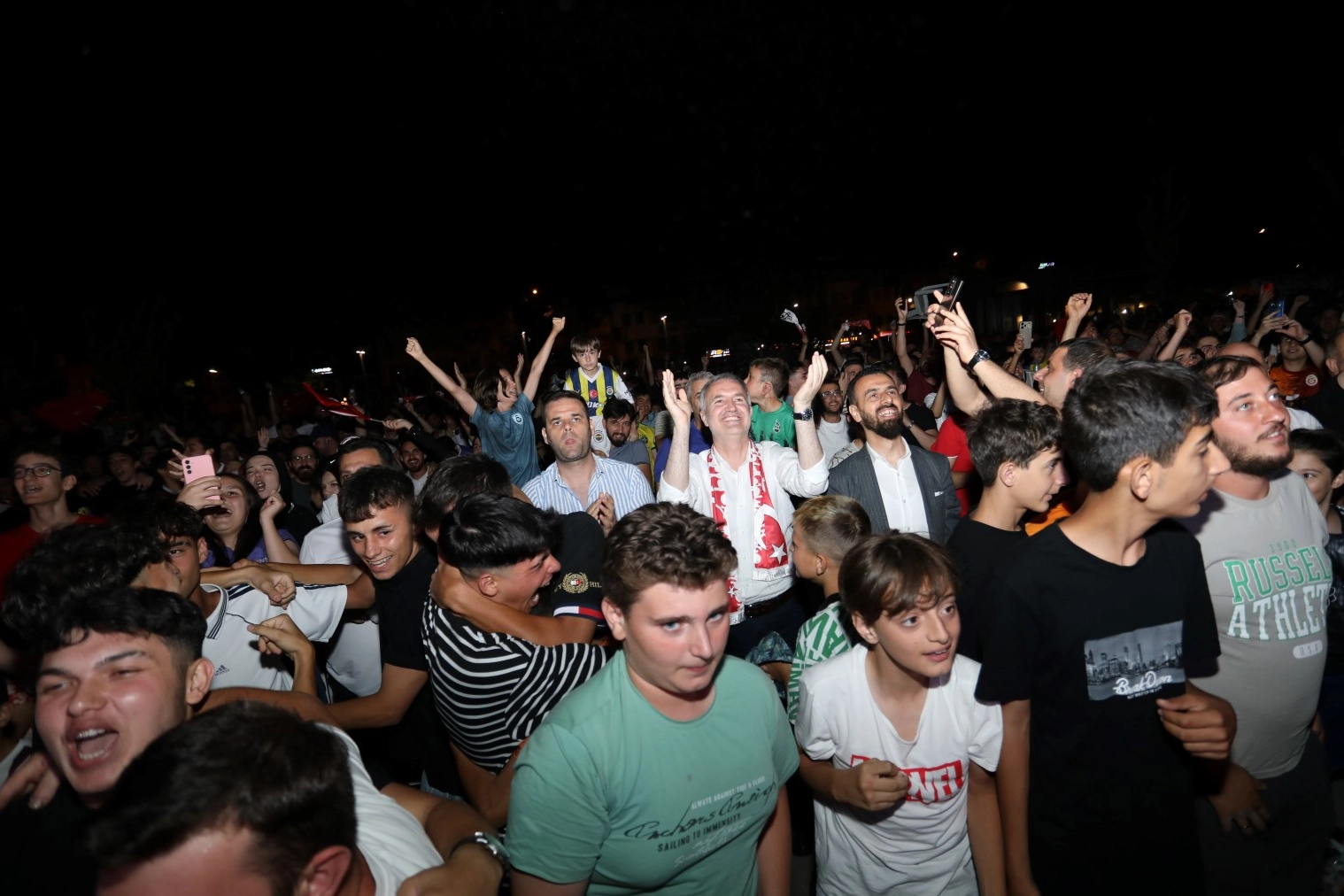 İnegöl Yeni Kent Meydanı ve Yaşam Alanında belediye hizmet binası önünde kurulan dev ekranda yüzlerce kişi karşılaşmayı birlikte takip etti. Belediye Başkanı Alper Taban da vatandaşların coşkusuna ortak oldu. 7’den 77’ye her yaştan vatandaşın izlediği karşılaşmada gollerden sonra İnegöl milli tribünü kucaklaşarak bu coşkuyu birlikte kutladı.