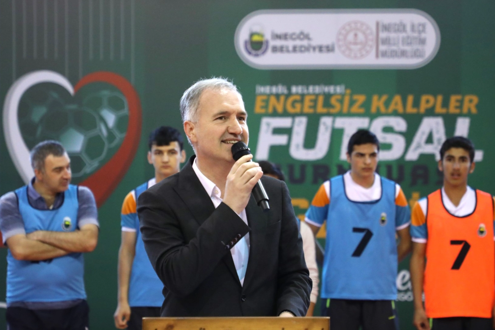 Engelsiz Kalpler Futsal Turnuvası İnegöl Belediye Spor Salonunda gerçekleştirildi. İnegöl Belediyesi Engelsiz Sosyal Yaşam Merkezi, Talha Ömer Faruk Teşik Özel Eğitim Uygulama Okulu 2. Kademe, İnegöl Belediyesi Özel Uygulama Okulu 3. Kademe, Halk Eğitim Merkezi 23 Yaş Üstü Kurs Merkezi ve Ömer Osman Çağlayan Özel Eğitim Okulu olmak üzere 5 takımın mücadele ettiği turnuvada, başlangıç vuruşunu Kaymakam Eren Arslan ile Belediye Başkanı Alper Taban yaptı. Her takım 6’şar kişiden oluştuğu turnuvada, müsabakalar büyük heyecana sahne oldu. 5 takım arasında toplam 4 müsabaka oynandı. Kıyasıya rekabetin yaşandığı maçların tamamlanmasının ardından, engelli öğrenciler için ödül töreni yapıldı. Turnuvayı İnegöl Engelsiz Yaşam Merkezi kazansa da tüm engelli bireylere kupa takdim edildi.