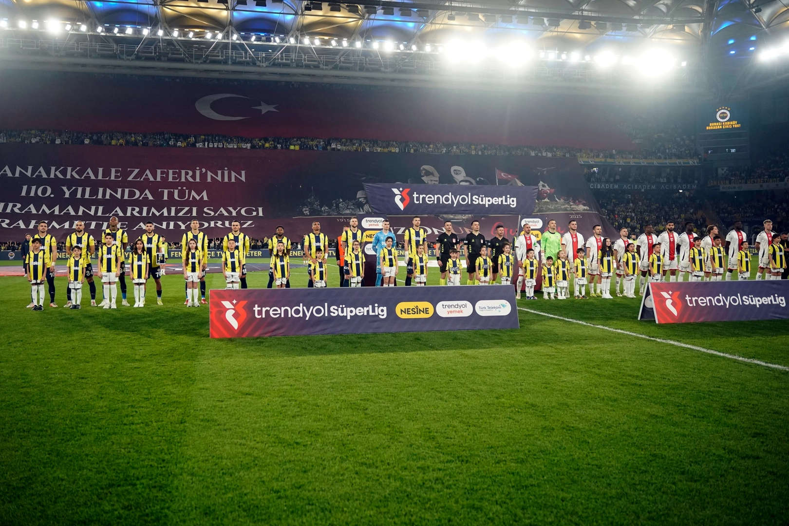 Fenerbahçe'nin Samsunspor'u konuk ettiği Trendyol Süper Lig maçı öncesi, Çanakkale Zaferi'nin 110. yılı dolayısıyla şehitler anıldı. Trendyol Süper Lig'in 28. haftasında Fenerbahçe, evinde Samsunspor ile karşılaşıyor. 18 Mart Çanakkale Zaferi haftası kapsamında, müsabaka öncesi aziz şehitler mesajlarla anıldı. Stat hoparlöründen, "Şehitlerimizin ruhu şad olsun. Çanakkale Zaferi'mizin 110. yılı kutlu olsun" anonsu yapıldı. Seremoni öncesi ise Maraton Üst Tribünü'nde dev Türk bayrağı; Maraton Alt Tribünü'nde ise üzerinde 'Çanakkale Zaferi'nin 110. yılında tüm kahramanlarımızı saygı ve rahmetle anıyoruz' yazısı ve Kurtuluş Savaşı'nın kahramanlarının resmedildiği pankart açıldı.