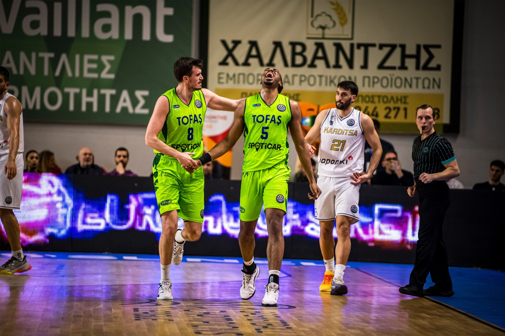 Basketball Champions League 2025-2026 sezonu TOP 16 turunda J Grubu’nda yer alan TOFAŞ, ikinci hafta mücadelesinde Yunanistan temsilcisi Karditsa Iaponiki’ye konuk oldu. Giannis Bourousis Karditsa’da oynanan maça Alex Perez, Furkan Korkmaz, Maxwell Lewis, Yiğitcan Saybir, Marek Blazevic beşiyle başlayan Mavi Yeşilliler, ilk basketini Yiğitcan Saybir ile buldu. Rakibin 9-0’lık serisine Furkan Korkmaz ile son veren Bursa ekibi, Maxwell Lewis ve Yiğitcan Saybir’in sayılarıyla 5. dakikada 9-10 öne geçti. Rakip sayılarına Marek Blazevic, Isaiah Whaley ile karşılık vermeye çalışan konuk takım, ilk periyodu 22-14 geride kapattı.