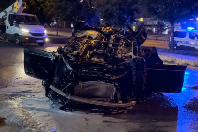 Bursa'da kontrolden çıkan araç refüje daldı. Ağaçları ve direkleri deviren otomobil takla atıp 150 metre savrulduktan sonra alev aldı. Araçta bulunan 2 kişi son anda kurtuldu. Hafif yaralı olarak hastaneye kaldırılan 2 kişi tedavi altına alınırken, araç kullanılamaz hale geldi.