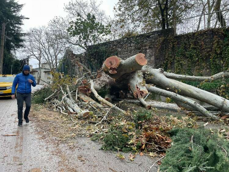 Saatteki hızı 95 kilometreye ulaşan fırtına sebebiyle devasa çınar kökünden koparak yola devrildi. Ekipler ağacın dallarını keserek trafiği açtı .