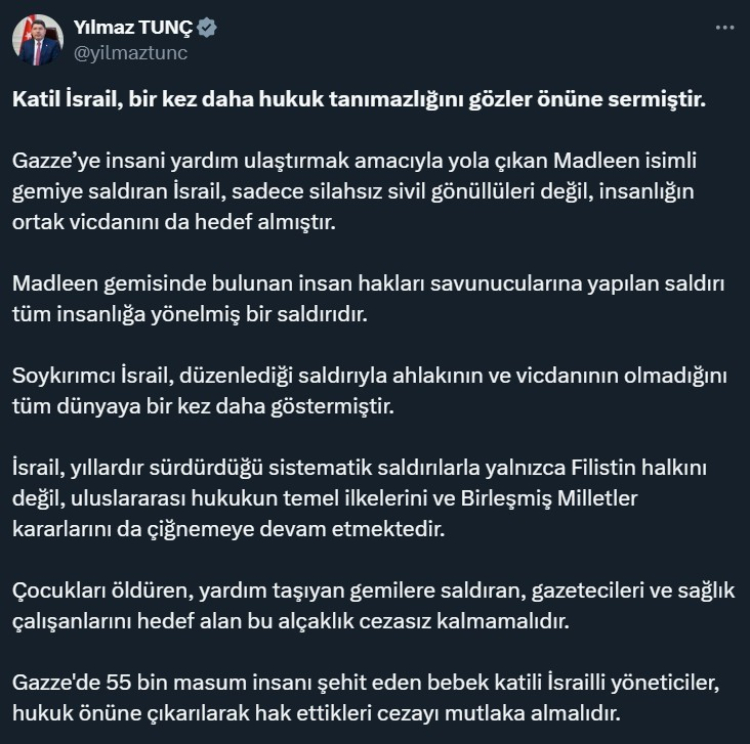 "Gazze’ye insani yardım ulaştırmak amacıyla yola çıkan Madleen isimli gemiye saldıran İsrail, sadece silahsız sivil gönüllüleri değil, insanlığın ortak vicdanını da hedef almıştır. Madleen gemisinde bulunan insan hakları savunucularına yapılan saldırı tüm insanlığa yönelmiş bir saldırıdır.
