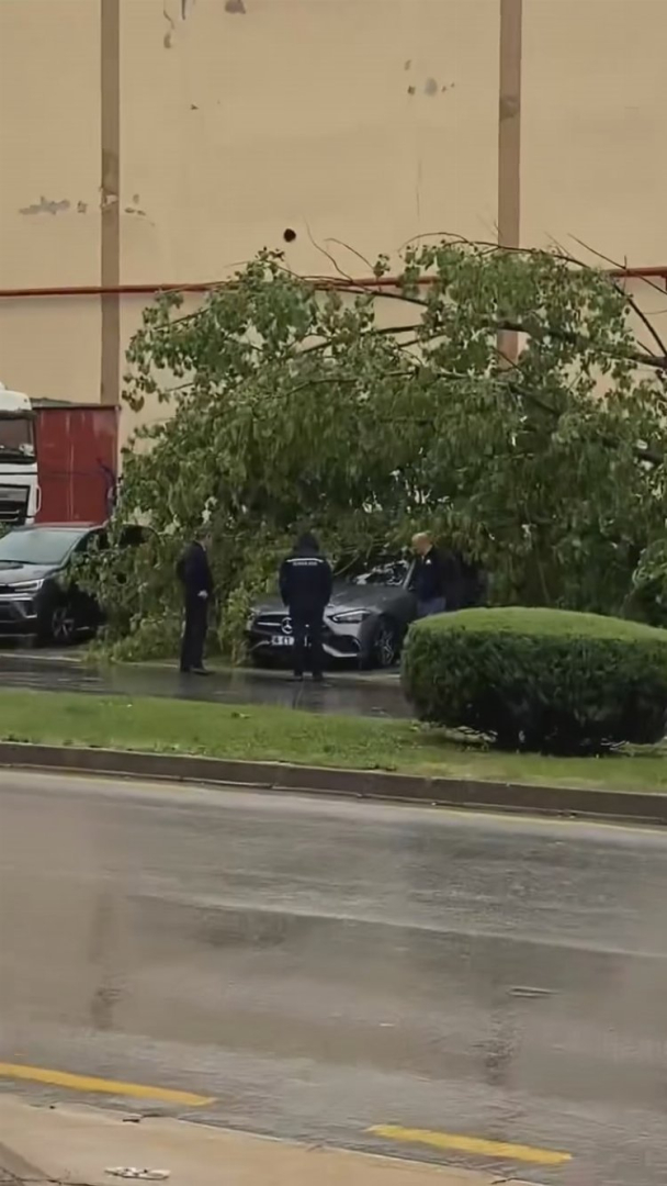 Bursa’da şiddetli yağış hayatı olumsuz etkiledi. Bazı bölgelerde kısa süreli fırtınaya dayanamayan ağaçlar gövdesinden kırılırken, Nilüfer ilçesinde ise devrilen ağaç lüks otomobilin üzerine düştü.