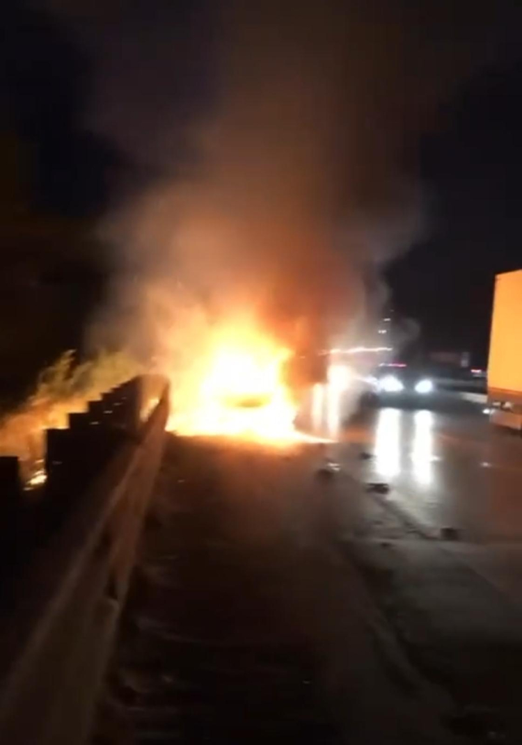 Aracı emniyet şeridine çekip araçtan uzaklaşan sürücü itfaiye haber verdiği sırada otomobil bomba gibi patladı. O anlar kameraya saniye saniye yansıdı.