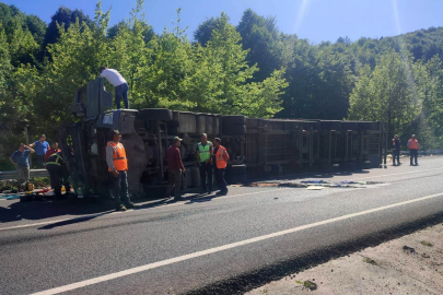 Kaza, saat 15.30 sıralarında Bursa-Ankara karayolu üzeri İnegöl'ün Mezit mevkiinde meydana geldi. İnegöl'den Eskişehir istikametine seyir halinde olan sürücü Milcan Pak (41) yönetimindeki 16 ASL 330 plakalı iplik yüklü tır, sürücüsünün kontrolünden çıkarak devrildi.