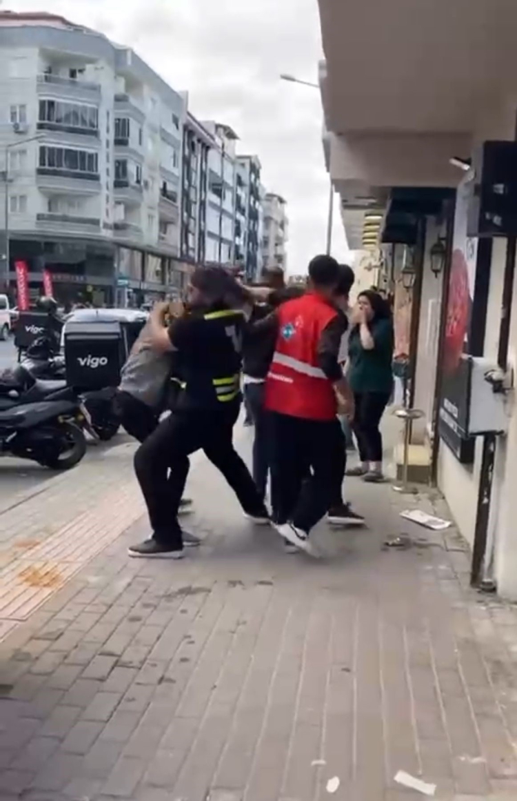 Bursa'da iki kurye arasında çıkan sözlü tartışma kavgaya döndü. Tarafların birbirlerine sopa ve yumruklarla vurduğu anlar kameraya saniye saniye yansıdı.