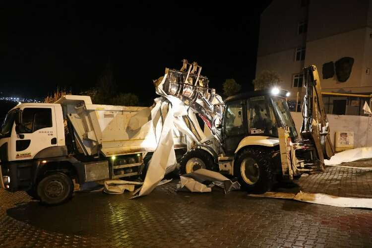 Okulun çatısından kopan metal parçalar kamyonlara yüklenerek bölgeden uzaklaştırıldı.