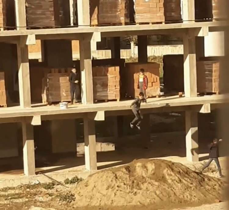 Olay, Yeni Mahalle'de inşaat halindeki bir binada meydana geldi. 5 çocuk, güvenlik önlemi alınmayan inşaata girip oyun oynamaya başladılar. Oyun sırasında 2. kattan kendilerini boşluğa bırakan çocuklar, kum yığını üzerine düştüler. Çocukların tehlikeli oyunu amatör kameraya saniye saniye yansıdı.