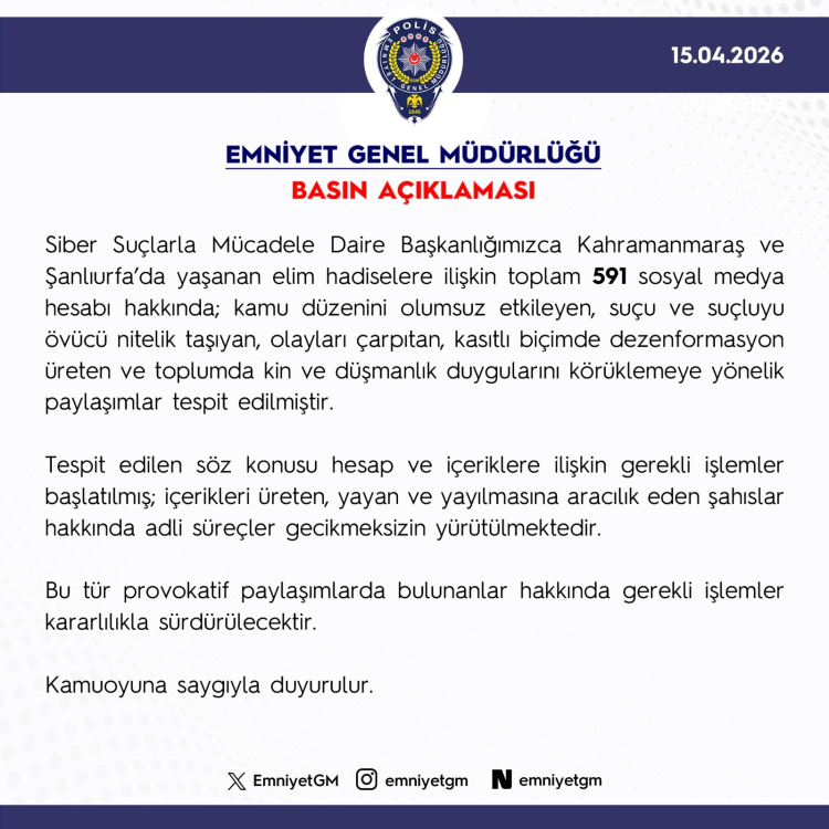 Emniyet Genel Müdürlüğü (EGM) tarafından yapılan açıklamada, "Siber Suçlarla Mücadele Daire Başkanlığımızca Kahramanmaraş Şanlıurfa'da yaşanan elim hadiselere ilişkin toplam 591 sosyal medya hesabı hakkında; kamu düzenini olumsuz etkileyen, suçu ve suçluyu övücü nitelik taşıyan, olayları çarpıtan, kasıtlı biçimde dezenformasyon üreten ve toplumda kin ve düşmanlık duygularını körüklemeye yönelik paylaşımlar tespit edilmiştir. Tespit edilen söz konusu hesap ve içeriklere ilişkin gerekli işlemler başlatılmış; içerikleri üreten, yayan ve yayılmasına aracılık eden şahıslar hakkında adli süreçler gecikmeksizin yürütülmektedir. Bu tür provokatif paylaşımlarda bulunanlar hakkında gerekli işlemler kararlılıkla sürdürülecektir" ifadelerine yer verildi.