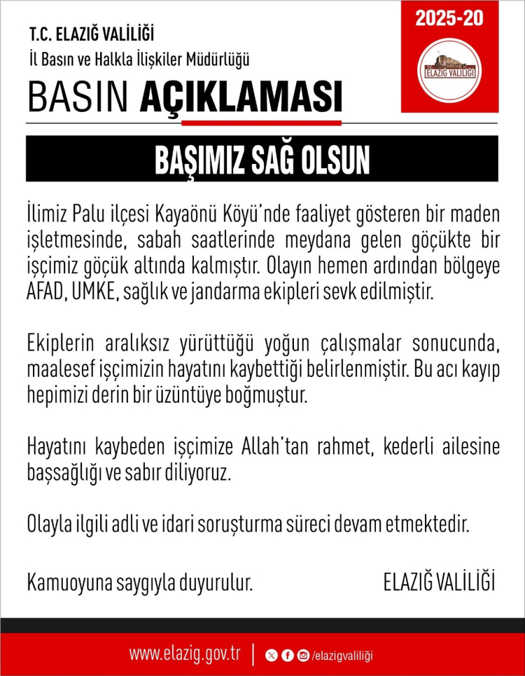 Vali Numan Hatipoğlu, "Öncelikle geçmiş olsun dileklerini iletiyorum. Sabah gerçekleşen kazada göçük altında kalan işçimizin cansız bedenine tahlisiye ekiplerimiz AFAD ekiplerimiz ulaşmış durumdalar. Birazdan çıkartacağız. Öncelikle ailesinin ve ilimizin başı sağ olsun diyorum. Yaklaşık 7 saat süren bir çaba sonucunda çıkarıldı. Çünkü içerideki malzeme oldukça yumuşaktı. Bu anlamda da bizim tahlisiye ekiplerimiz olağanüstü bir gayret sarf ederek bu çalışmayı gerçekleştirdiler. Tekrar hem ailesine hem sevenlerine geçmiş olsun dileklerimi iletiyorum" dedi.