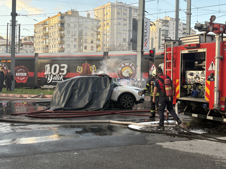 Kayseri’nin Melikgazi ilçesinde seyir halindeyken alev alan elektrikli otomobil, itfaiye ekiplerinin "yangın battaniyesi" kullanarak yaptığı müdahaleyle söndürüldü.