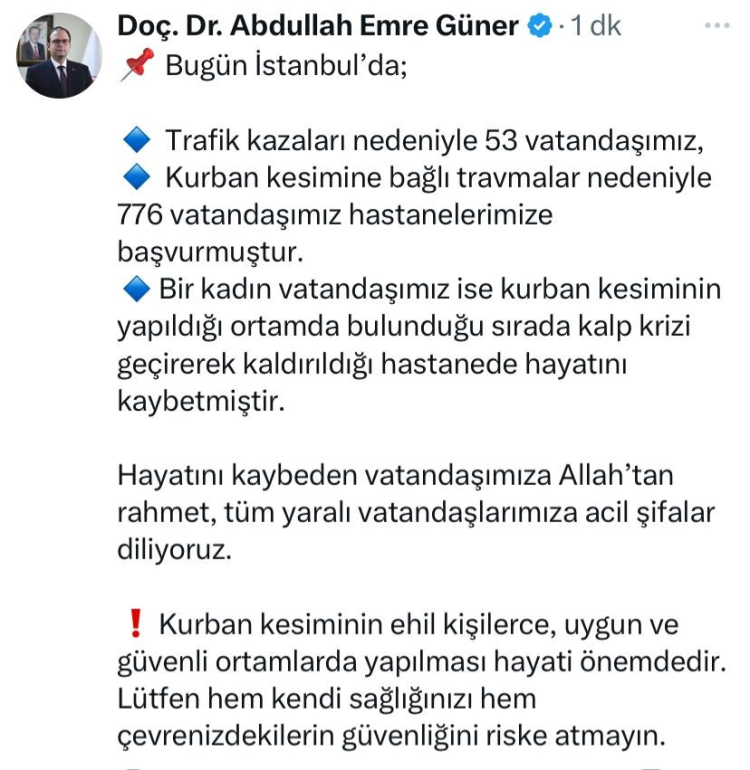İstanbul İl Sağlık Müdürü Doç. Dr. Abdullah Emre Güner, sosyal medya hesabından yaptığı açıklamada, "Bugün İstanbul’da trafik kazaları nedeniyle 53 vatandaşımız, kurban kesimine bağlı travmalar nedeniyle 776 vatandaşımız hastanelerimize başvurmuştur. Bir kadın vatandaşımız ise kurban kesiminin yapıldığı ortamda bulunduğu sırada kalp krizi geçirerek kaldırıldığı hastanede hayatını kaybetmiştir. Hayatını kaybeden vatandaşımıza Allah’tan rahmet, tüm yaralı vatandaşlarımıza acil şifalar diliyoruz. Kurban kesiminin ehil kişilerce, uygun ve güvenli ortamlarda yapılması hayati önemdedir. Lütfen hem kendi sağlığınızı hem çevrenizdekilerin güvenliğini riske atmayın" ifadelerini kullandı.