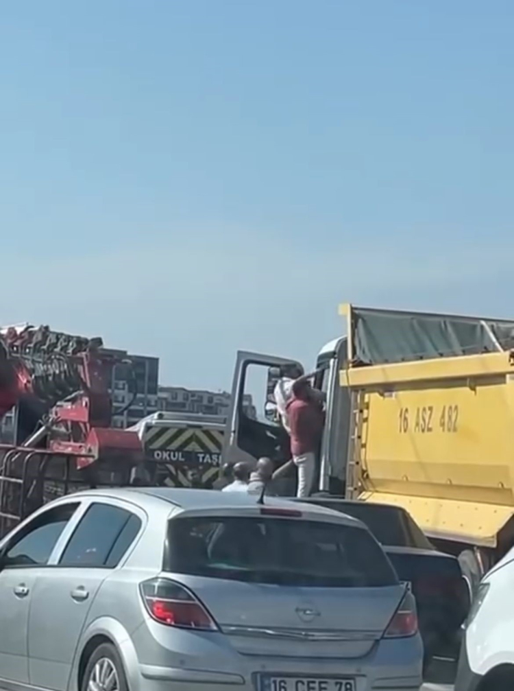 Olay, merkez Yıldırım ilçesi Millet Mahallesi mevkiinde meydana geldi. Akşam trafiğinin yoğun olduğu saatlerde seyir halindeki bir otomobilin sürücüsü ile anayolda ilerleyen kamyon sürücüsü iddiaya göre yol verme tartışması nedeniyle kavgaya tutuştu. Öfkeli otomobil sürücüsü, araçtan indiği arkadaşıyla kamyonun kupa kısmına tırmanıp, kamyon şoförünü darp etti. O anları gören bazı vatandaşlar kavgaya tutuşan tarafları ayırmaya çalışırken, kimisi de klaksonlarla tepki gösterdi. Tarafların güçlükle ayırıldığı kavga anı ise amatör kameraya yansıdı.