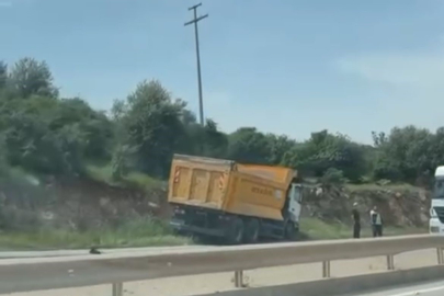 Bursa'nın Kestel ilçesinde kontrolden çıkan bir kamyon yol kenarındaki bariyerleri aşarak refüje daldı.