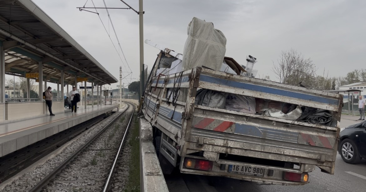 Bursa'da sürücüsünün kontrolünden çıkan kamyonet metronun bariyerlerine çarptı.