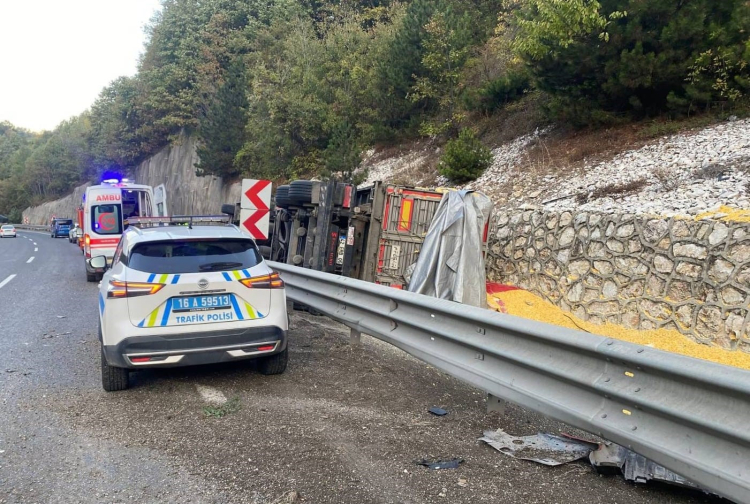 Bursa'nın İnegöl ilçesinde kontrolden çıkan yem yüklü TIR devrildi, sürücü ve eşi yaralandı.
