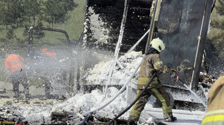 Edinilen bilgilere göre, Pendik’ten hareket eden 34 HLL 359 plakalı köpük sprey yüklü kamyon, seyir halindeyken yanmaya başladı. Kısa sürede büyüyen yangın sırasında kamyon kasasında bulunan köpük spreyler art arda patladı.